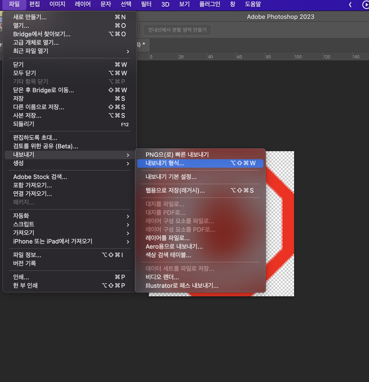 7. 색상을 바꾼 아이콘을 저장하기 위해서는 상단의 메뉴바에서 '파일' > '내보내기' > '내보내기 형식'을 선택해줍니다. 단축키로 한번에 열 수도 있는데 단축키는 'cmd + ctrl + shift + w'(Window는 ctrl + alt + shift + w) 입니다.
