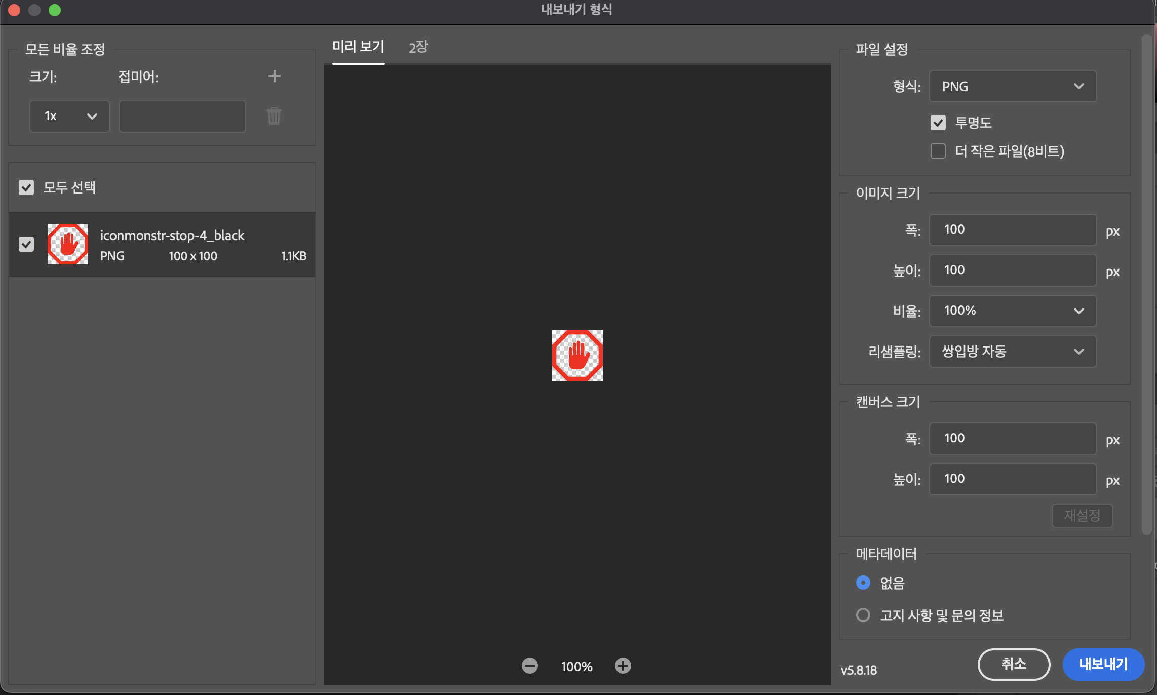 8. '내보내기 형식' 창에서는 원하는 저장형식과 아이콘 이미지 크기를 설정할 수 있습니다. 원하는 형식을 설정 후 '내보내기'를 클릭합니다.