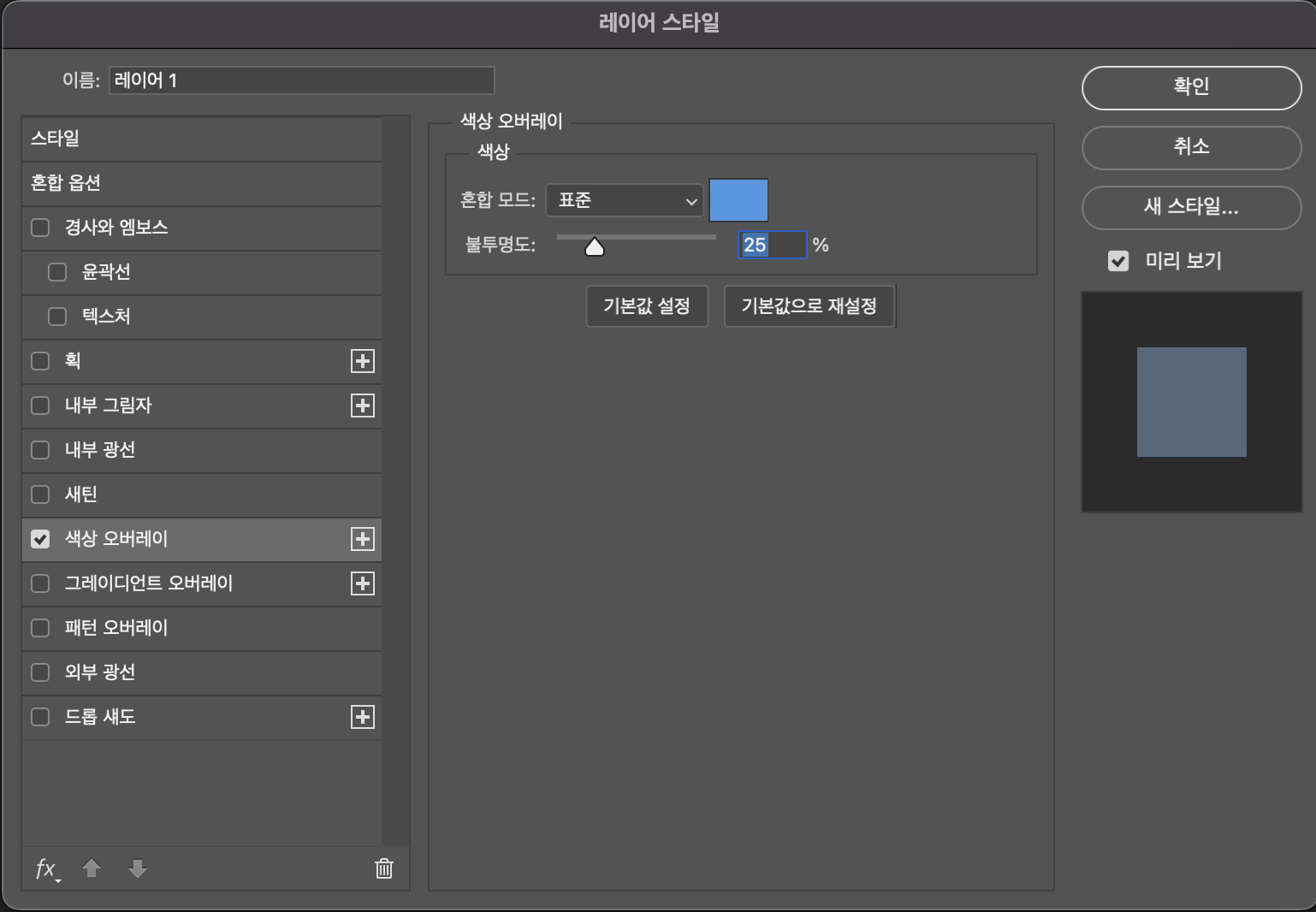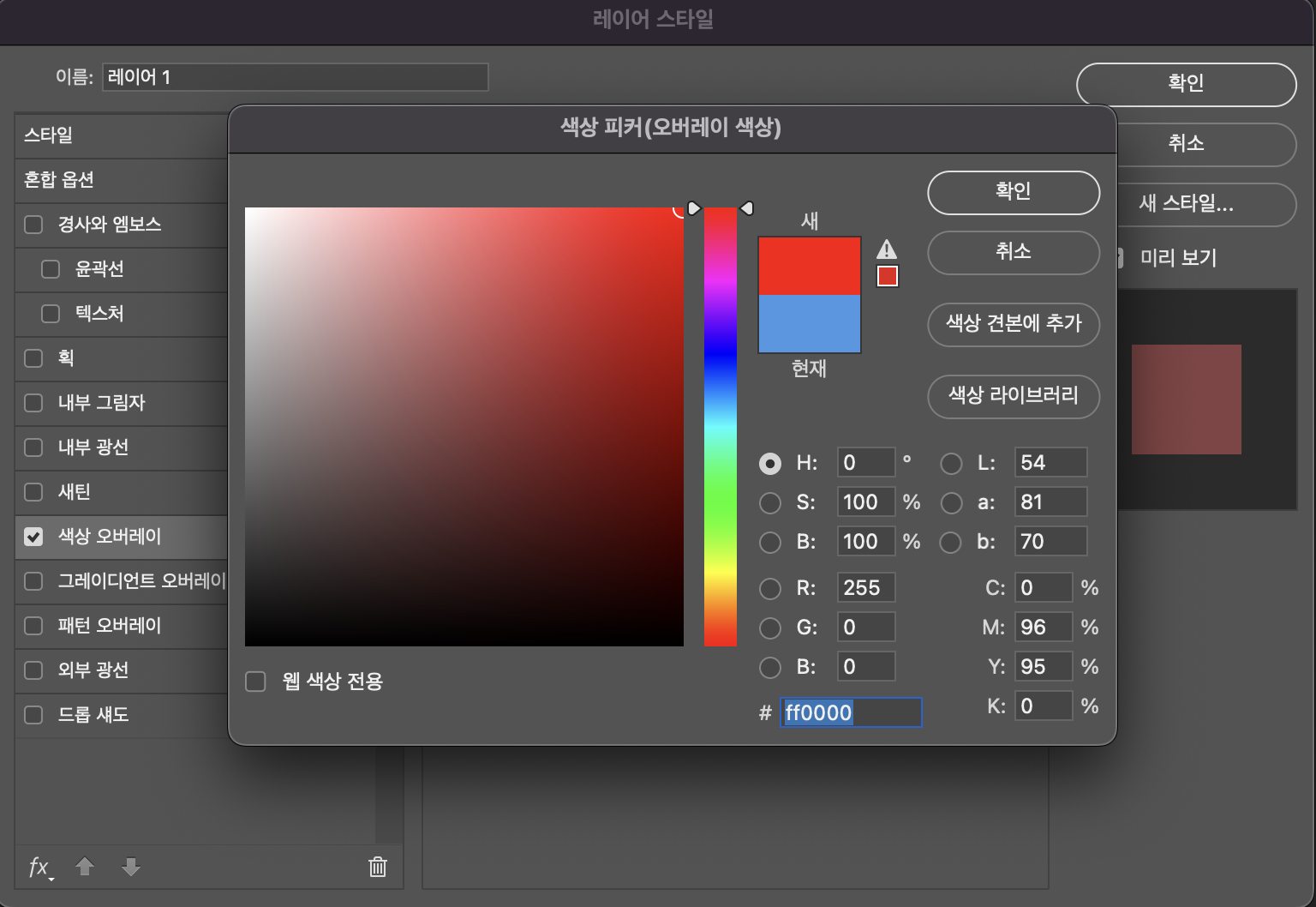 3. 해당 레이어를 더블클릭하면 아래 사진처럼 '레이어 스타일'이라는 창이 뜨는데 좌측 항목에서 '색상 오버레이'를 클릭해줍니다.